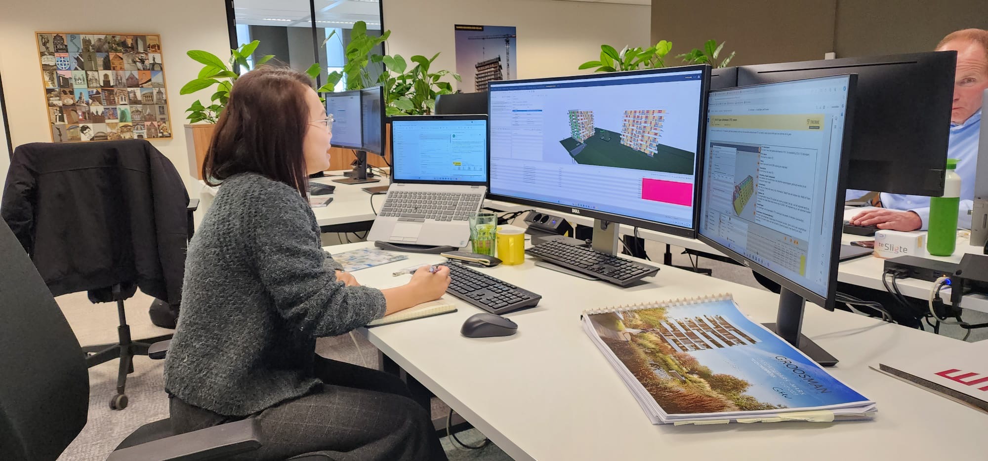 De afgelopen periode is Christy onder andere op bezoek geweest bij De Coninxpoort in Lelystad. Hier realiseert Trebbe een nieuw woongebouw met 96 huurappartementen voor Centrada. De toren wordt 43 meter hoog en is straks één van de hoogste woontorens in de stad. “In Hongkong zijn er ook veel hoge gebouwen, ook wel een stuk hoger dan dit”, verteld Christy lachend. De hoogtes van de gebouwen in Nederland maken dus niet per se indruk, wel merkte Christy andere verschillen op. “Ik vind het fijn dat mensen in Nederland heel direct zijn. Ze zijn niet bang om hun mening te geven en het wordt ook gewaardeerd als je zelf een mening geeft. Er is ruimte voor een grapje. Ook merk ik dat er bij Trebbe geen hiërarchie is, dat maakt het fijn om hier te werken.” Qua werkzaamheden hield Christy zich bezig met de hoeveelheden van materialen. “Vroeger deed ik dit vooral op papier of met Excel en nu heb ik ook de programma’s Solibri en Bluebeam leren kennen. In mijn tijd bij Trebbe werd ik goed betrokken door collega’s. Ook zijn alle collega’s heel aardig en behulpzaam. Bijvoorbeeld met het uitleggen van werkzaamheden of het meewerken aan interviews. Voor school moest ik namelijk collega’s in het Nederlands interviewen. Dat was voor mij best spannend, maar omdat de collega’s mij graag wilden helpen, verdween deze spanning al snel.”